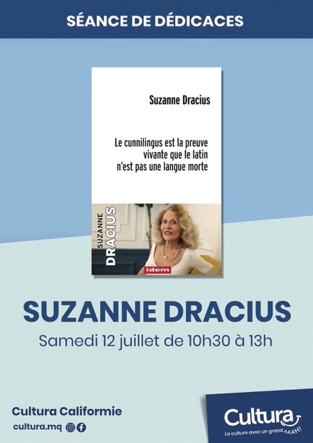 Fraîchement rentrée en Martinique, l’écrivaine Suzanne Dracius donne rendez-vous à ses lectrices et lecteurs ce samedi 12 juillet de 10 h 30 à 13 h à Cultura Californie pour une séance de dédicaces exceptionnelle. Elle y présentera son dernier ouvrage au titre évocateur : Le cunnilingus est la preuve vivante que le latin n’est pas une langue morte, un roman en miscellanées qui interroge, dérange et séduit.