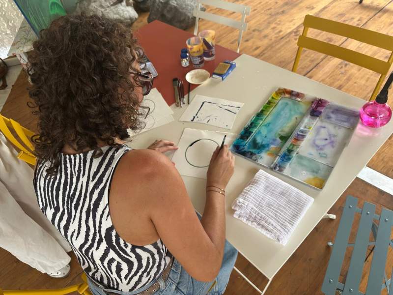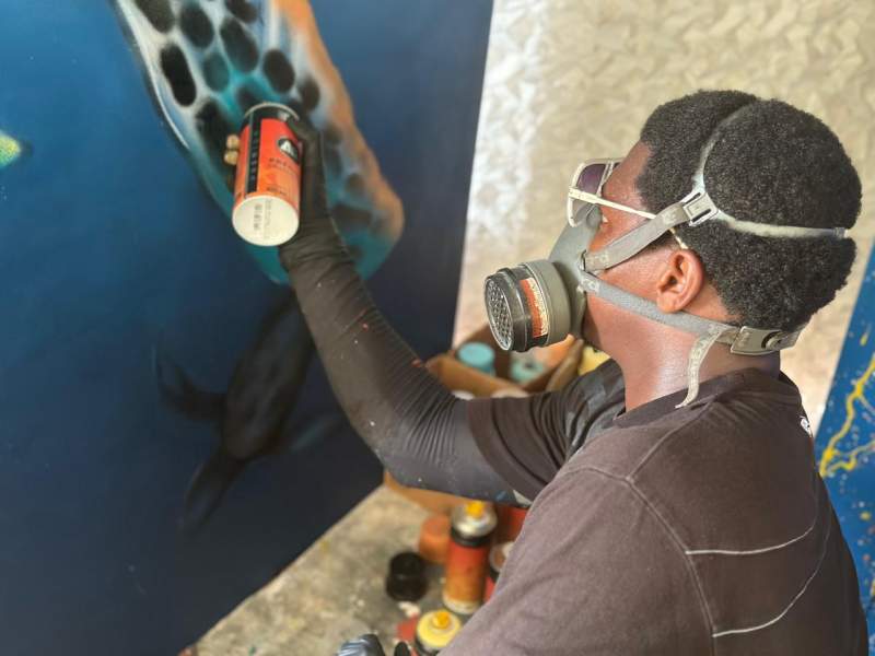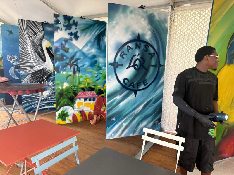 Penchée sur sa feuille de dessin parfaitement carrée, Indigo aquarelle trempe son pinceau dans l’eau puis esquisse les premières lignes de son œuvre. Tout près, Oshea graffe un oiseau emblématique de l’île, le sucrier. Plus loin, c’est None graffeur également. Lui, a choisi de figurer une tortue marine. L’aquarelliste et les deux graffeurs s’affairent dans le village d’arrivée de la transat Café L’Or. Plus précisément sous le chapiteau dédié à l’espace des initiatives positives. On n’entend que le bruit du spray sur le support en bois et les billes des bombes secouées par les graffeurs. La concentration est de mise pour finaliser la décoration de l’EIP. La thématique est évidente. Tout tourne autour de la mer et de ce qui fait l’unicité de la Martinique.