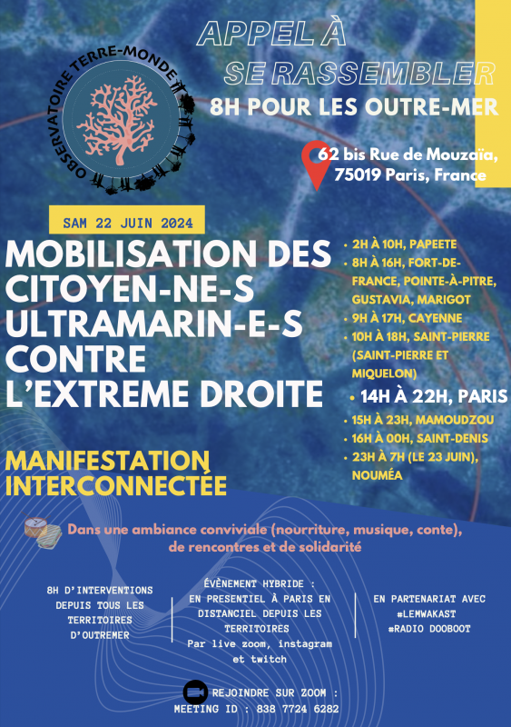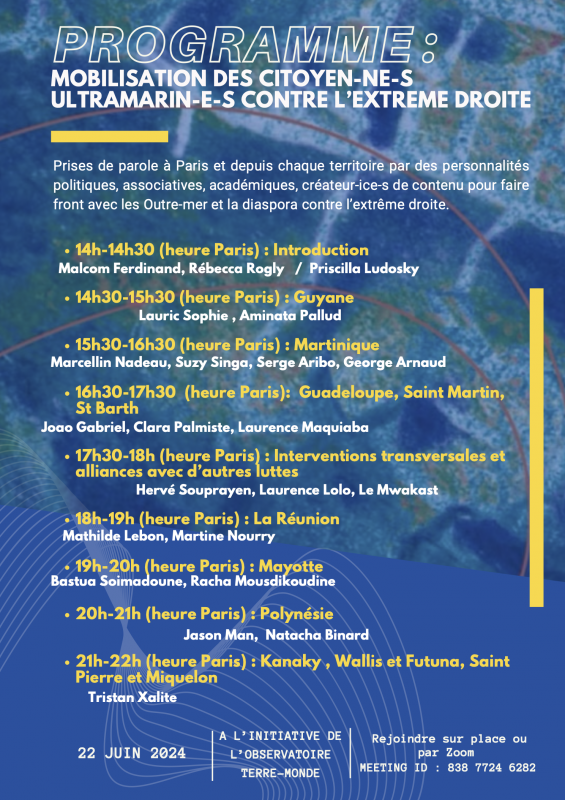 L’Observatoire Terre-Monde vous invite vivement à participer ce samedi 22 juin au grand événement de mobilisation de la communauté ultramarine, des territoires et de la diaspora, pour faire front contre l’extrême-droite.